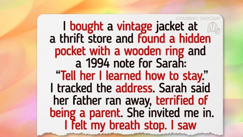 I found a vintage jacket at a thrift store and discovered a hidden pocket inside. There was a hand-carved wooden ring and a note from 1994 asking to deliver it to someone named Sarah. I tracked the address and met Sarah, who revealed her father had returned years ago after leaving before she was born. When he saw the ring, he broke down. In that moment, pain and forgiveness met, and Sarah reminded him that love can survive even a lifetime of mistakes.
