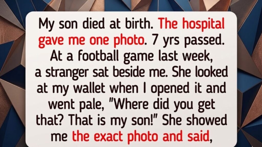 My son died at birth and the hospital gave me one photo, just one. I have carried it in my wallet every single day for seven years because it is the only proof I have that he existed and was real and was mine. Last week I was at a football game and a woman sat down beside me and when I opened my wallet to pay for something, she went completely pale and said, “Where did you get that? That is my son!” She pulled out her own phone and showed me the same photo and I could not understand what I was seeing.